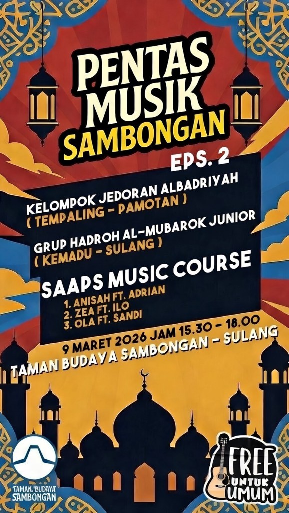 Rembang – Kegiatan seni musik kembali digelar di Taman Budaya Sambongan (TBS) Sulang Rembang melalui acara Pentas Musik Sambongan Episode 2 yang akan berlangsung pada 9 Maret 2026 pukul 15.30 hingga 18.00 WIB. Acara ini terbuka untuk umum dan dapat dinikmati secara gratis oleh masyarakat. Dan juga disiarkan live youtube Sigid Channel.
